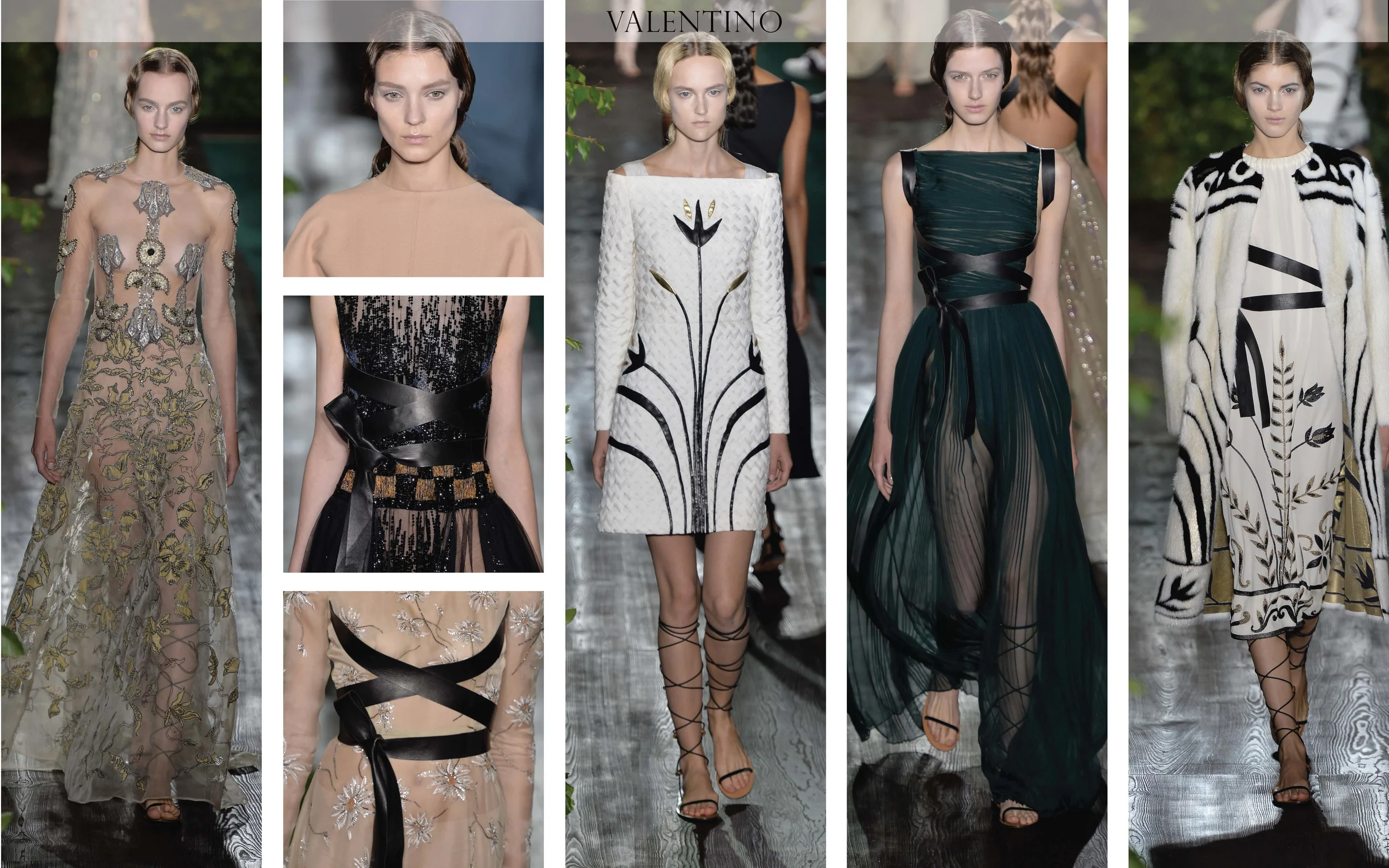 Valentino: For this collection Maria Grazia Chiuri and Pierpaolo Piccioli modernized aspects of Roman folklore and mythology. Heavy embroidery and pleated tulle created a romantic feel. The Roman toga silhouette was updated with clean lines and leather ceintures. Strappy leather sandals and botanical embroidered motifs gave the collection a rustic elegance.