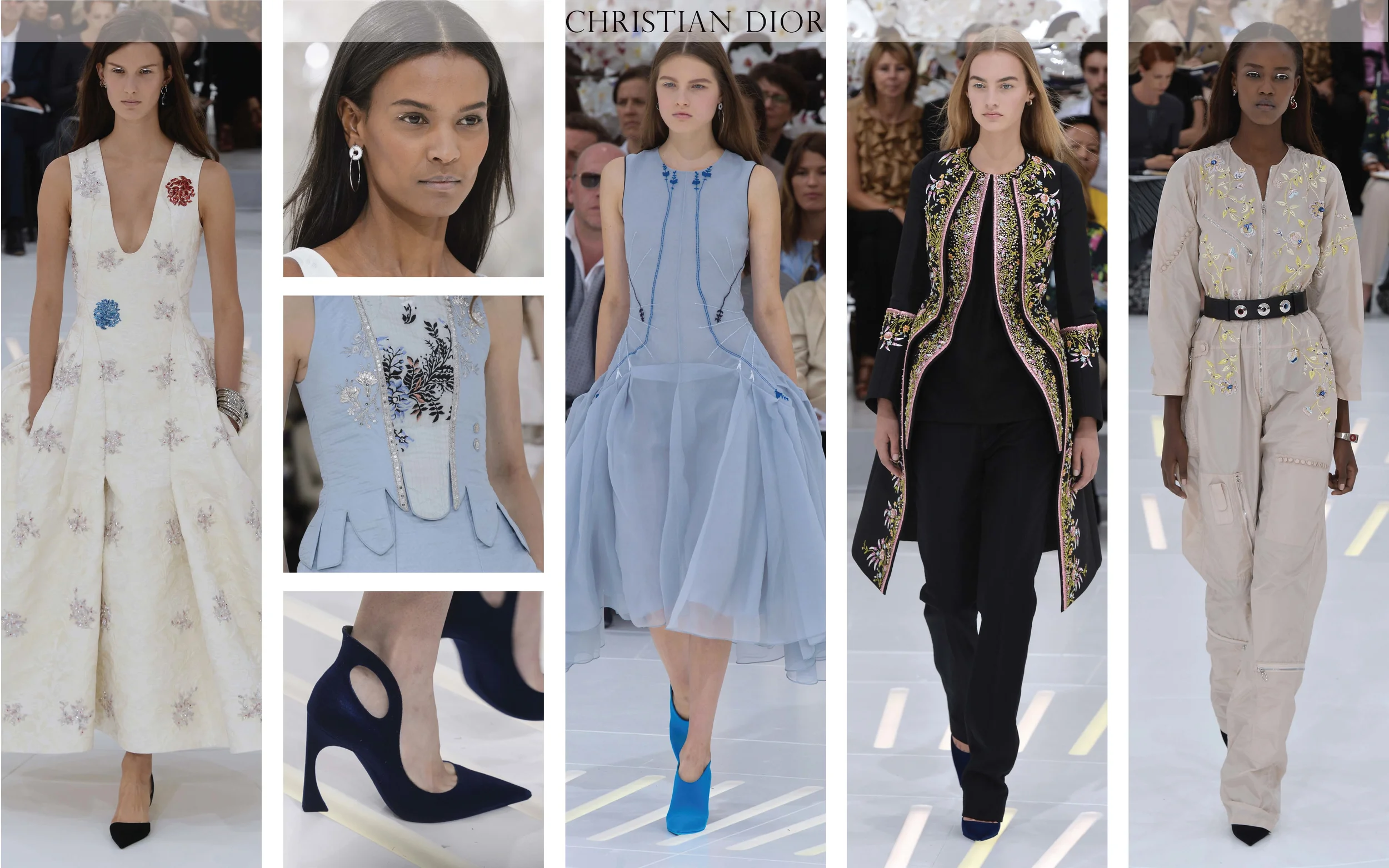 Christian Dior: “I was interested in the process of finding something extremely modern, through something very historical; particularly through a juxtaposition of different themes,” explains Raf Simons. "The historical inspiration is not the justification of the collection; it isn't its entire meaning. What I was attracted to was an idea of architectural construction - that is a very Dior attitude – and how the foundations of one era are based on another, how the future is based on the past; that is what I found fascinating (Dior.com).” Unlike many designers, Simons didn’t restrict himself to one decade for historical inspiration. He explored history as a whole in hope to define modern in a new light. The show had eight sections where silhouettes from the Marie Antoinette era to the flight exploration era were reinterpreted in a very Dior style. Delicate embroidery and embellishments along with a spring-like yet cool color selection keep the collection elegant and cohesive. Raf Simon share more about his inspiration on Dior.com